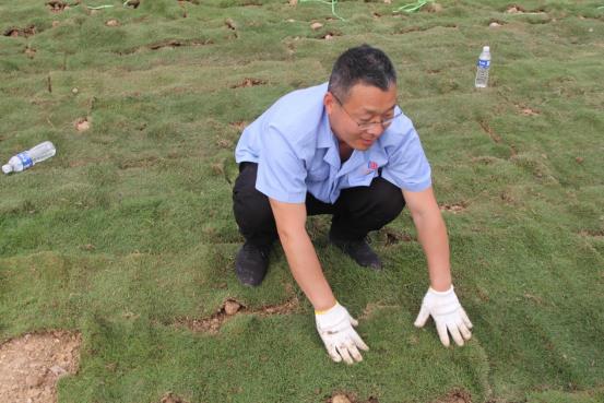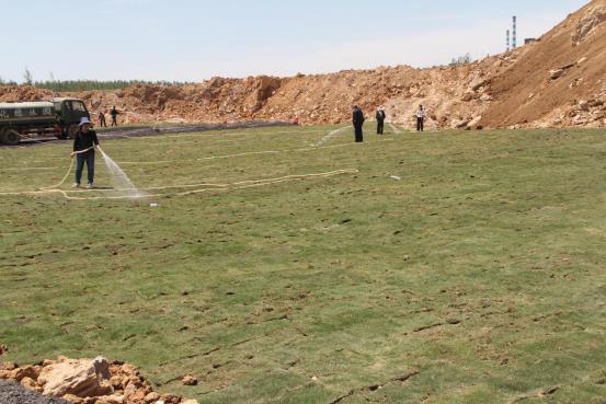 只见大家分工协作,认真地完成每一道工序。有的在平整土地、有的在铺种草皮、有的在浇水,干的热火朝天。在大家的共同努力下,当天袁店南矿山恢复治理区内15000余平方米的草坪铺设铺种完成,为矿山披上了绿衣。