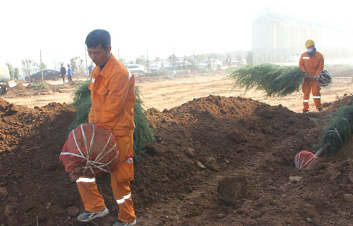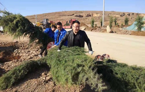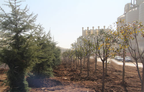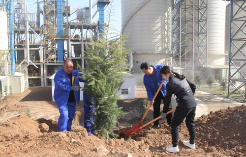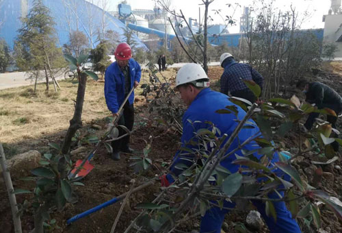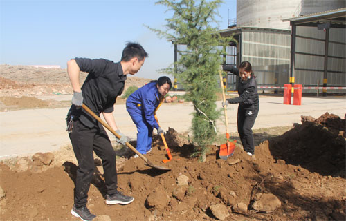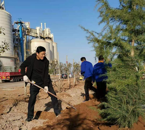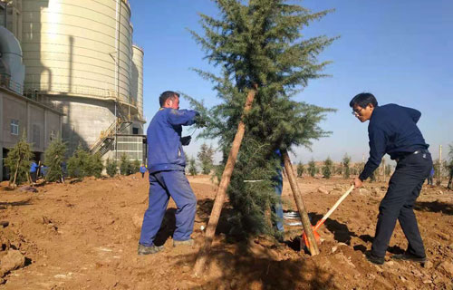 一排排新栽的树木横成排,竖成列,整齐有序,迎风挺立,形成了一道道生机勃勃的风景线。既美化了环境,又锻炼了员工的身体健康,增进了彼此间的团结协作意识。