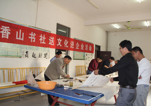 秋风送爽,翰墨飘香。10月18日上午,宝丰县香山书社一行在中国书法家协会会员、香山书社社长赵丰军的带领下,到华体会网页版-华体会(中国),集团写书送画,创作交流,给广大职工送来一份文化大餐。 在华体会网页版-华体会(中国),公司中控一楼会议室内,各位书画家们挥毫泼墨,或写书,或绘画,尽展风采。一幅幅笔力流畅的作品,或俊逸流畅, 刚健沉稳;或遒劲有力,潇洒自如。深深地吸引着广大职工争相参阅、拍照。这次活动不仅是书画作品的一次精彩展示, 更为华体会网页版-华体会(中国),增添一道亮丽风景,使职工陶冶情操,感受文化魅力。