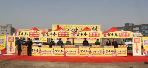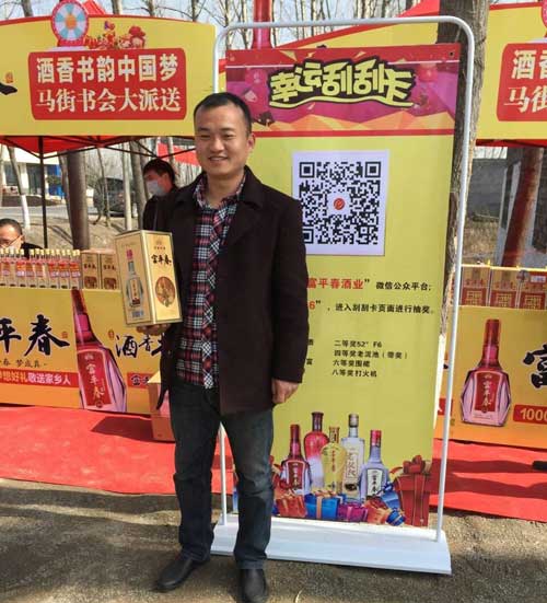 富平春酒业展台 为了献情马街书会,活跃会场气氛,富平春酒业可谓用尽心思,精心策划,周密布置,在会场搭建了多个展台,设置多个品酒点、停车点、引导点,通过形式多样的互动交流,真心为群众,服务献真情。让酒香与书韵相合,使酒文化与曲艺文化共融,相继推出了“酒香书韵中国梦,富平春马街书会大派送”活动,凡关注富平春微信公众平台,通过扫描二维码可免费领取富平春华贵酒、F6、F3等八种不同的奖项,引来广大过往群众纷纷驻足参与,在各个展台,笔者看到人潮涌动,络绎不绝,在志愿者的细心引导下,有的拿起手机扫描,有的正在品酒,有的正在领奖,那高兴的样子,怎一个“乐”字了得。同时,为给广大群众提供更多方便,富平春酒业还精心布置好两个停车区,推出了别具匠心地推出停车赠酒活动,凡凭停车票可免费领取老泥池酒一瓶,让你既能停车又能领酒,可谓一举两得。