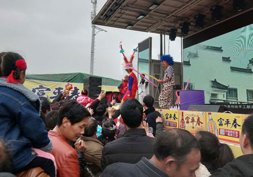 精彩的魔术表演 美酒当纵歌,划拳论英雄。“富平春杯”拳王争霸赛正在激情上演,吆五喝六的酒令,代表着一种有趣的酒文化,引得众多父老乡亲的积极参与和蜂拥而至的围观人群,场面盛大,气氛热烈,此伏彼起的掌声、笑声、欢呼声响彻整个会场,成为马街书会一道独特的风景线。为了活跃现场气氛,贾湖酒业还准备了精彩纷呈的节目,戏曲、歌舞、摇滚、魔术轮番上阵,更有嘻哈大师、滑稽小丑前来助兴,用气球现场编织出各种小动物送给小朋友们。同时,扑克牌、吉祥物、打火机等精美礼品,引来大家的疯抢。
