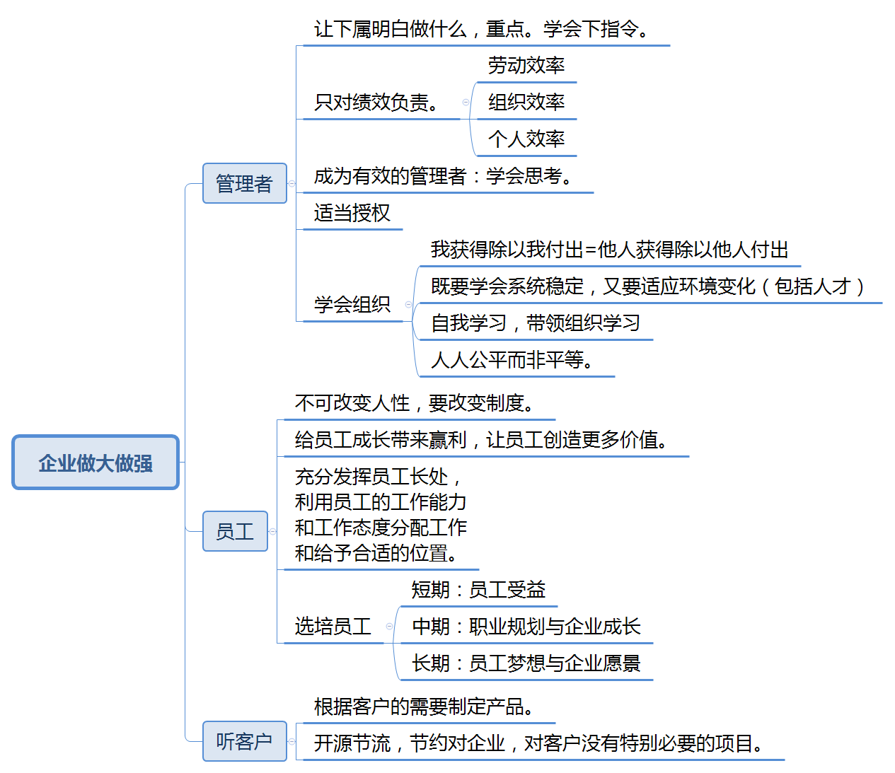 为期5天的中旭培训学习结束了,非常感谢公司对我的信任,为我提供了这次宝贵的学习机会。管理者的五项修炼,使我收获很大,自己对管理这件事和管理者资格角色都有了更深刻的认识,这些知识对于今后的工作有很大的帮助和提升。 管理者的五项修炼,从基层,中层到高层管理者,全面的讲解了什么是管理者,如何成为一名合格的优秀的管理者。不仅使我对当下的工作有了新的认识,也对未来的的工作有了更明确的方向。同时,对集团的很多决策有了深入的理解,对华体会网页版-华体会(中国),也有了新的认知,加深了对企业的认同感。 以下是这5天培训的一些心得体会: 一、管理者与管理的目的 管理者的作用是解决问题而不是成为问题,管理是为了解决效率问题。 管理者不是每天坐在办公室里思考问题,而是要发现问题并能够解决问题。没有调查,就没有发言权。所以要经常与上下级沟通,发现问题才能弄清楚问题的根本原因。与上级沟通能够更好的理解领导布置的任务,与下级沟通能够了解每个人的长短处,分工才能让正确的人去做正确的事。 二、通过改变制度从而改变人的行为 制度就像河道,人就像河道里的水,水本身没有好坏,人也一样。 制定一个适合自己公司门的制度不仅可以约束员工,同时还能激励员工。每个企业和部门都有不同的实际情况,制定制度不能生搬硬套,没有最好的制度,只有适合的制度。 三、管理始终为经营服务 一般人们总是说经营管理,在培训之前我也一直以为是一件事,通过培训学习才知道,两者有着本质的区别。 经营解决收入问题,管理是为了控制支出;经营是为了增大被减数,管理是为了减小减数;管理做的再好也不会做到不支出,但是经营不好却可能没有收入。经营的第一要素是客户价值,公司对外经营有客户,部门对内经营一样有客户。一条生产线、上下游部门之间、平行部门之间都是彼此的客户,经营好各部门的客户才能有效合作、减少浪费和失误,才能真正做到减小减数,提高公司利润。 四、管理事和领导人 俗话说,铁打的营盘流水的兵,其实就是说的流程管理。 一个公司,一个部门,一个岗位,人员都在不停的流动。通过制定一个固定有效的流程,可以很好的避免因为人员流动造成的重复培训浪费、提高工作效率。比如以我现在的岗位中控操作员为例,按照操作规程操作,新进的学徒也可以很快掌握操作的要点重点,学习起来就事半功倍。 五、管理追求对等而非平等 因为分工不同,每个人承担的责任是不一样的,所以每个人的回报也是不一样的。在看到自己和别人回报的差别时应当首先想一下我们担当到的责任是不是一样,付出是不是一样。责任,权力,利益相互平衡,管理才能平衡,任意一点失衡,人们就会通过牺牲另外两点来弥补。 另外,通过学习,我对企业如何做的更好有了初步的认识,如下图: